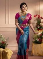 This exquisite Aqua Blue Litchi Silk Zari Jacquard Saree is a stunning combination of traditional elegance and contemporary charm. Crafted with utmost care, the saree features a luxurious litchi silk fabric that offers a smooth and silky texture. The fabric is known for its rich sheen, which adds to the overall grace and sophistication of the saree. The jacquard weave is intricately designed, creating a visually appealing pattern that enhances the aesthetic beauty of the sare, making it perfect for festive occasions.