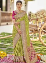 Adorn yourself in the epitome of elegance with this resplendent yellow saree exquisitely crafted to captivate hearts and turn heads. Crafted from luxurious art silk its vibrant yellow hue evokes a sense of joy and radiance perfect for any celebratory occasion. The saree is adorned with intricate Benarasi zari and jacquard work showcasing a harmonious blend of traditional craftsmanship and contemporary allure. The golden motifs delicately woven into the fabric add a touch of regal splendor elevating its allure to new heights. Contrasting the sunny yellow backdrop delicate pink accents grace the saree creating a captivating visual contrast that accentuates its beauty. The subtle yet striking floral and motif work in pink further enhances its charm adding depth and dimension to the ensemble. Completing the ensemble is a meticulously tailored blouse in matching pink customdesigned to complement the saree flawlessly. Embellished with coordinating floral and motif work the blouse adds a touch of sophistication and completes the look with finesse. Indulge in timeless elegance and exquisite craftsmanship with this breathtaking ensemble a true testament to the timeless allure of Indian traditional attire. Whether its a wedding festival or any special occasion this ensemble is sure to make you the epitome of grace and style.