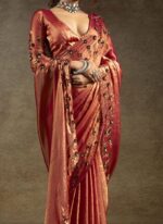 - Dark peach fendi satin silk saree is a contemporary statement piece designed to enhance your festive wardrobe with a unique shimmer and refined elegance. The fabric carries a textured sheen that drapes smoothly and creates a fluid silhouette. Highlighting its surface are detailed hand embroidered accents arranged across the pleats and pallu. These embellishments reflect traditional artistry in a very modern palette.