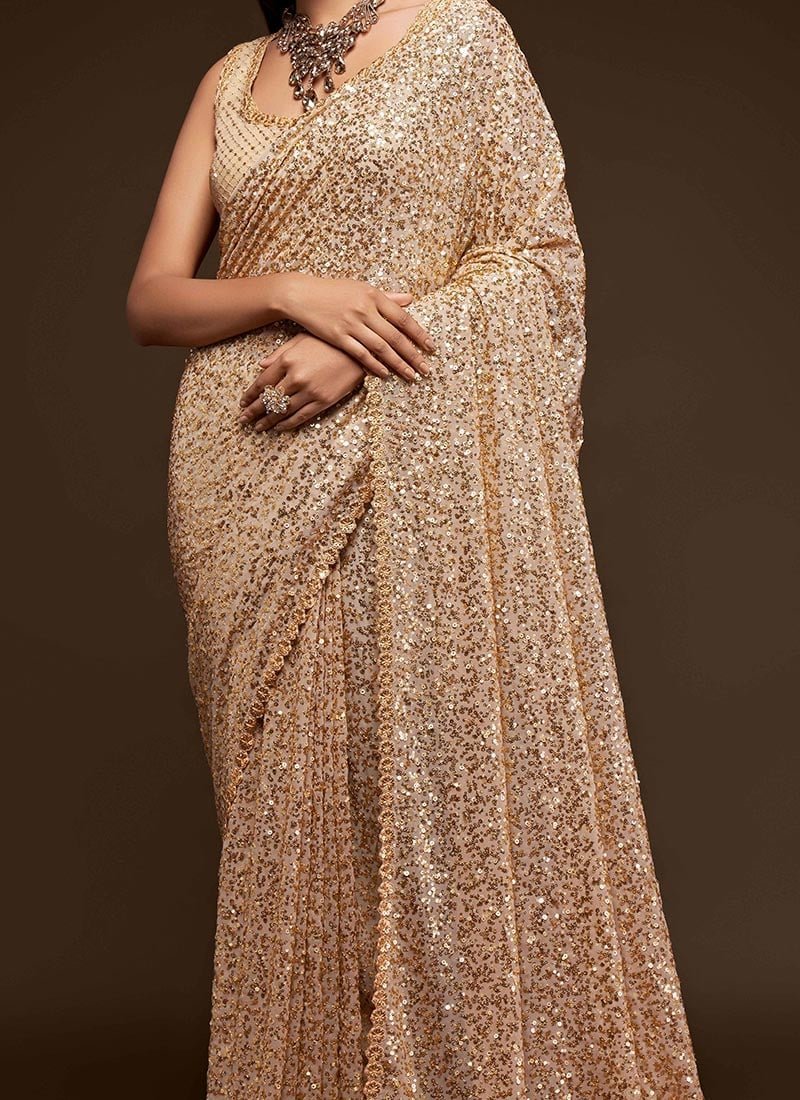 Comes with unstitched blouse fabric. To have the blouse stitched, please select the custom tailoring options. Blouses with elaborate patterns and colors are used for photo-shoot. Color and pattern of the blouse might not be as shown in the image.