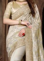 Light beige art silk saree with embroidered floral patterns on the saree. Comes with matching blouse.