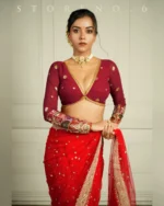• Multi-Colour Sequins and Thread Works on Deep Maroon Georgette Blouse. Full Sleeves With Diamond-Shaped Back