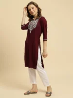 Home Kurtis Long Kurtis Wine Silk Embroidered Kashmiri Kurti